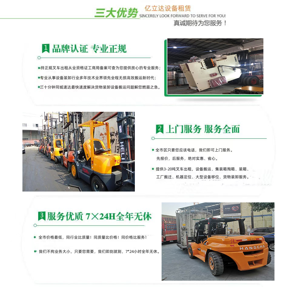 亿立达设备租赁有限公司是工商局准许的中国传媒大学专业叉车出租公司,公司本着诚信、服务、效率、创新的经营理念,用精湛的技术,真诚的服务,为众多客户提供优质的服务,同时获得信赖与支持。专业提供中国传媒大学3-20吨叉车出租、叉车租赁、设备搬运、集装箱掏箱装箱、机器移位定位、货物装卸、工厂搬迁、安全可靠,收费透明,价格便宜,随叫随到,24小时上门服务!本公司叉车吊车师傅对各种设备搬运装卸都有深刻探讨和研究。很多的疑难设备搬运,通过我公司的叉车师傅都能迎刃而解。对各种进口设备、国产机器、大型设备搬迁、高难度搬迁、各种精密仪器、医疗设备、科研设备等都能搬运; 提供全市 24 小时上门装卸搬运服务。同时提供厂房搬迁服务。 ...